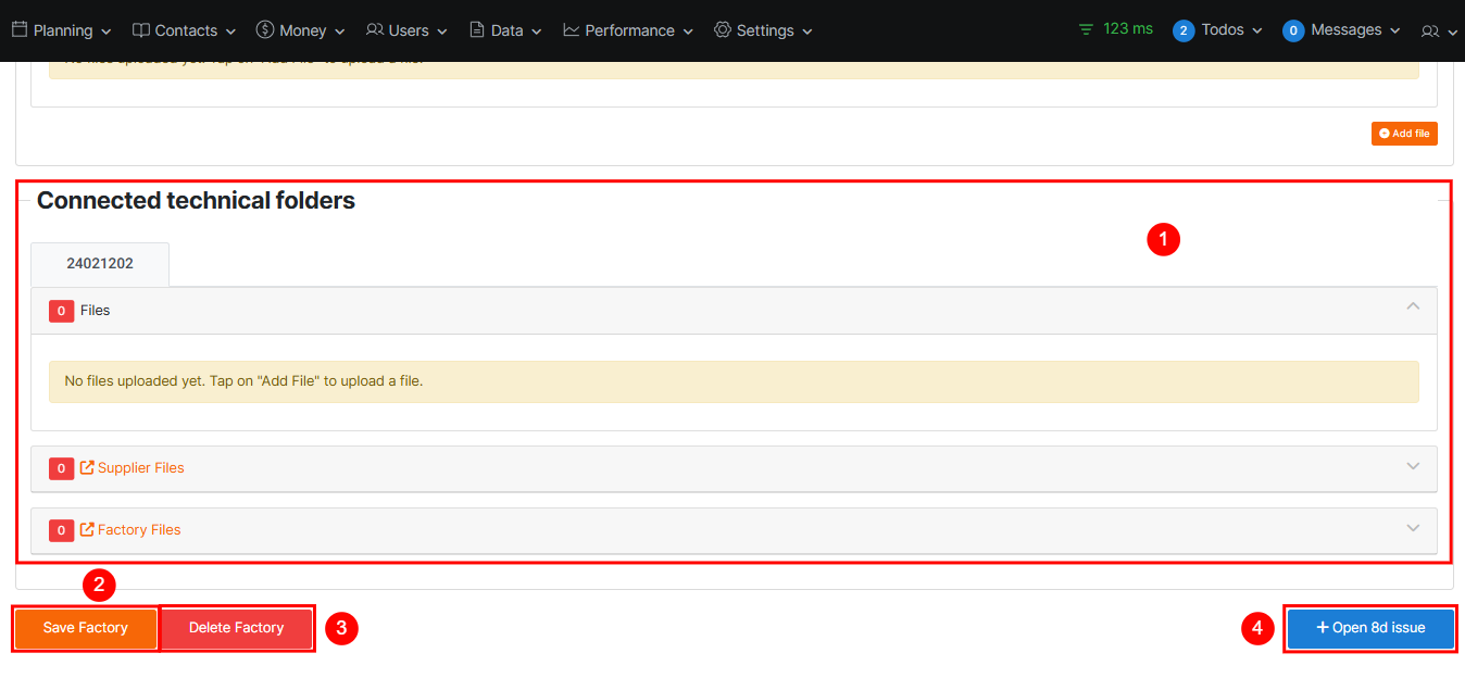 | 1 | Connected Technical Folders | Displays all technical folders related to the factory. These may include supplier files, factory files, or uploaded documents. |