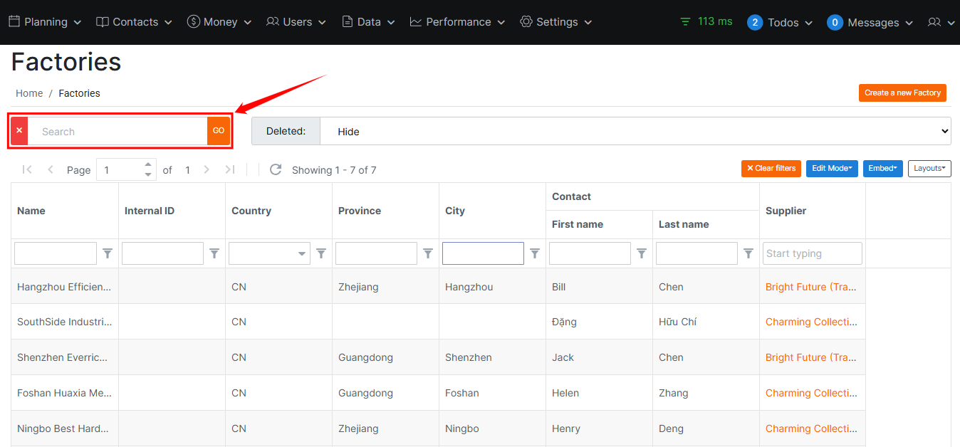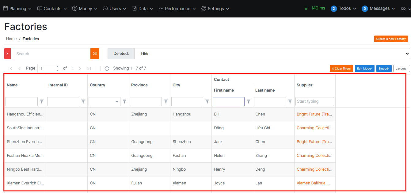 The Factory List module includes advanced management tools similar to the Supplier List.