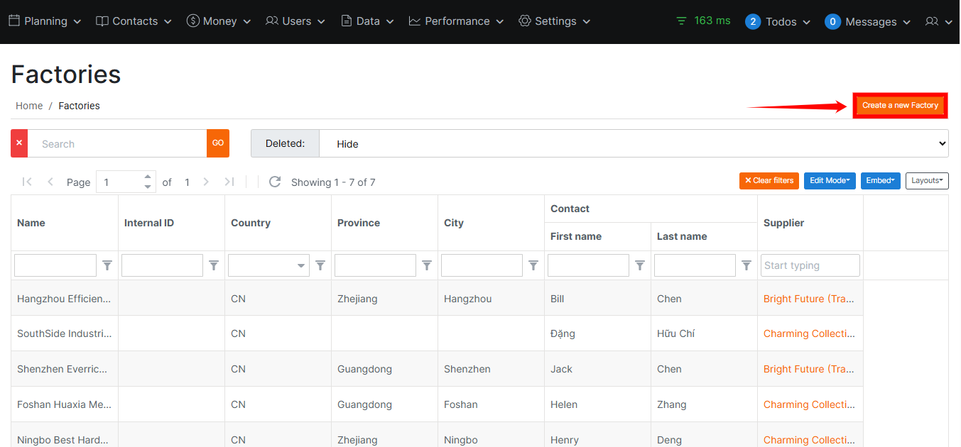 You can view, edit, or update a factory’s information directly from the list or by opening its detailed record.