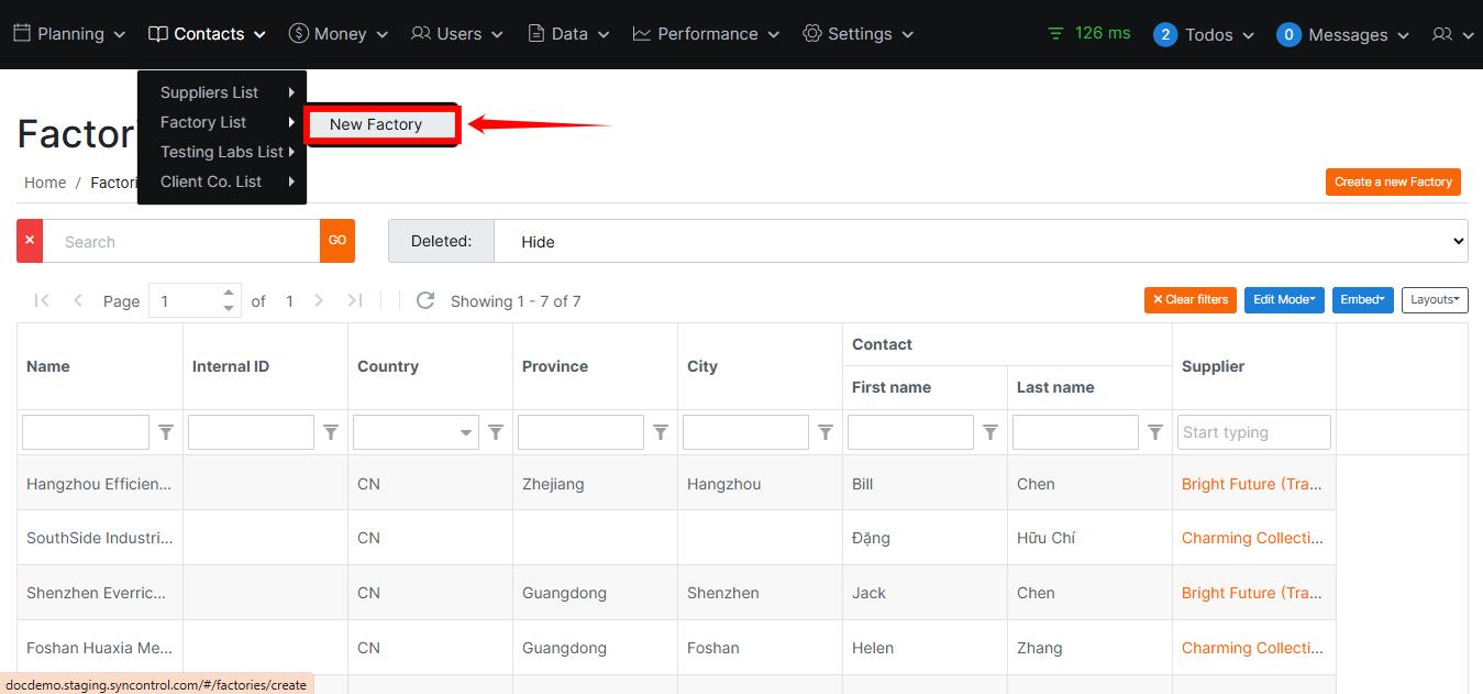 Found in: Contacts > Factory listThe Factory List is where you manage all factory information linked to suppliers. You can record new factories, assign them to suppliers, add location and production details, and store contact information for smooth coordination. This centralizes your manufacturing data to streamline supplier relationships, improve visibility, and ensure quality traceability across production facilities.