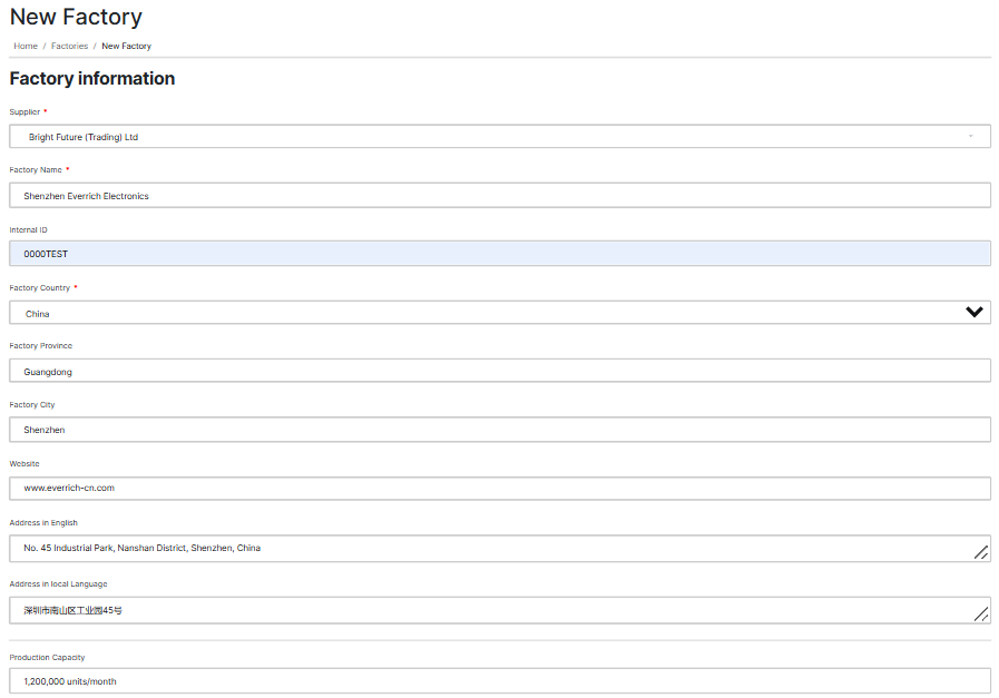 When adding a new production facility, you can register it through the “New Factory” form. It allows you to link the factory to its supplier, input full address details, and add contact information for factory personnel.