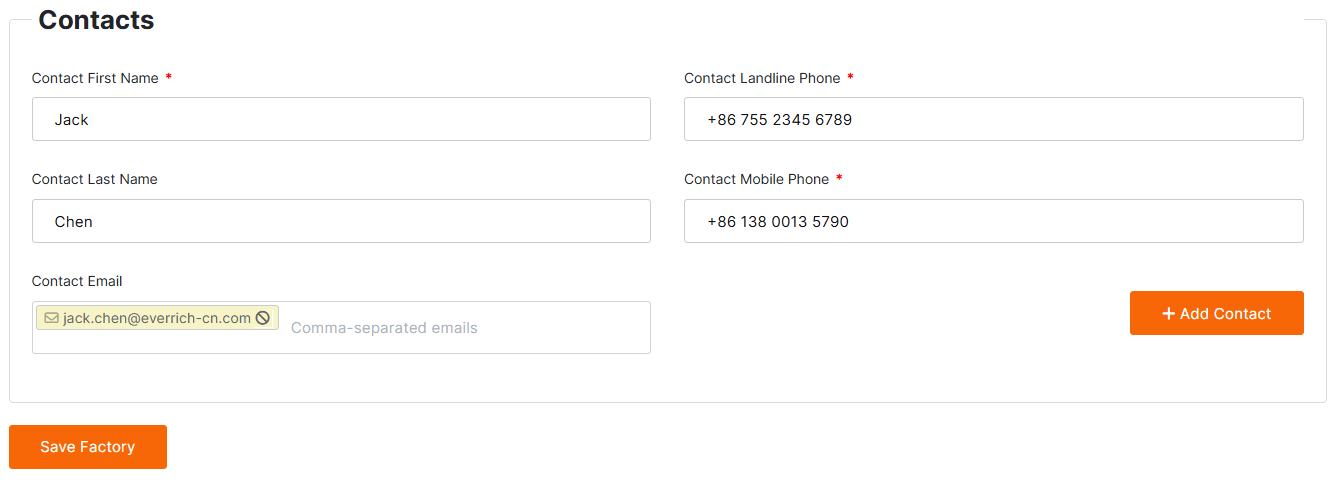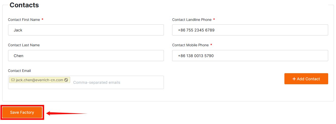 | 6 | Add Contact (orange button) | Add multiple contact persons for the same factory. |