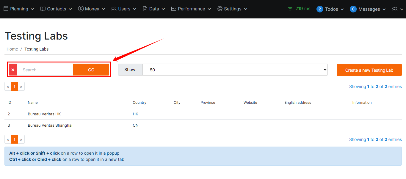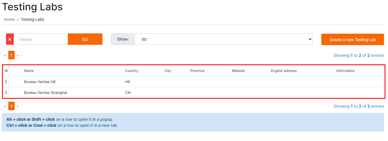 Use the Search box and filters (like Show 10, 25, or 50 entries) to quickly find a testing lab by name, location, or country.