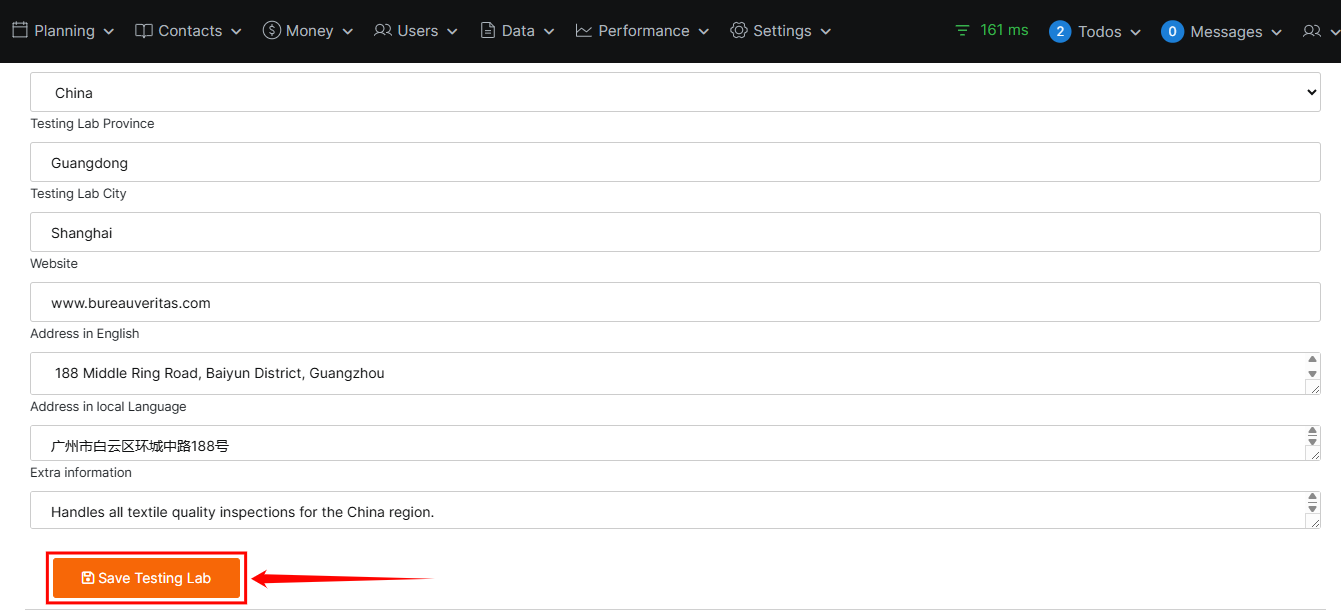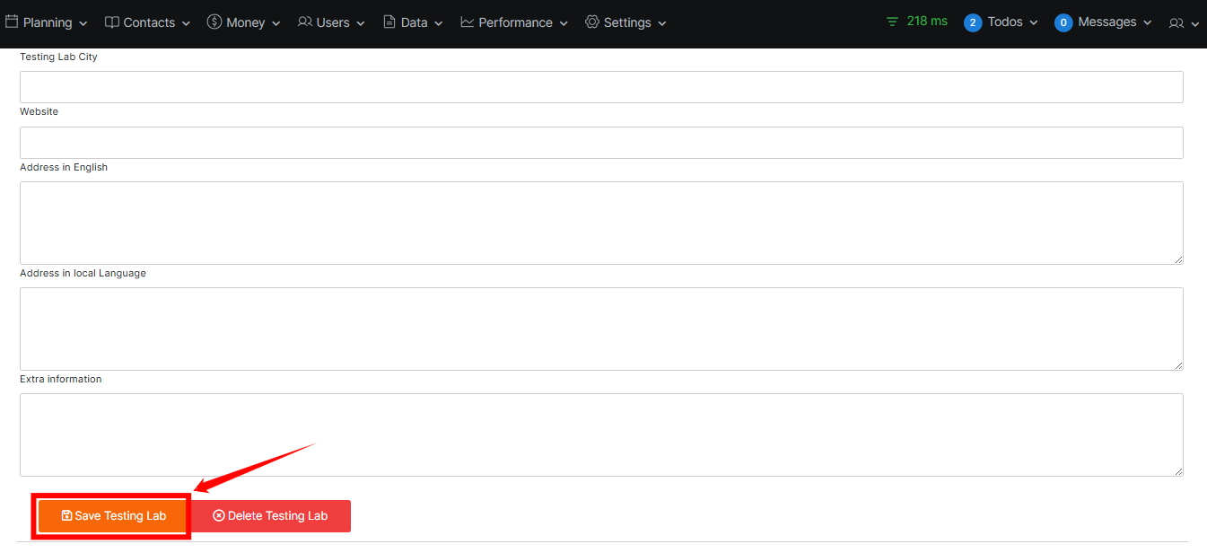 Once you have defined all the required fields then click on the Save Testing Lab button to save the New Testing lab.