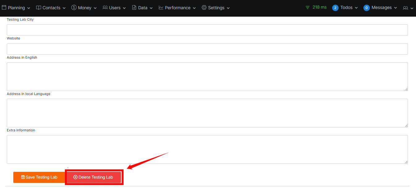 You can delete a testing lab when it is no longer active or needed in the system. Deleting a lab permanently removes its record and all related information from the platform. Make sure to review the lab’s details before deletion, as once removed, the record cannot be recovered.