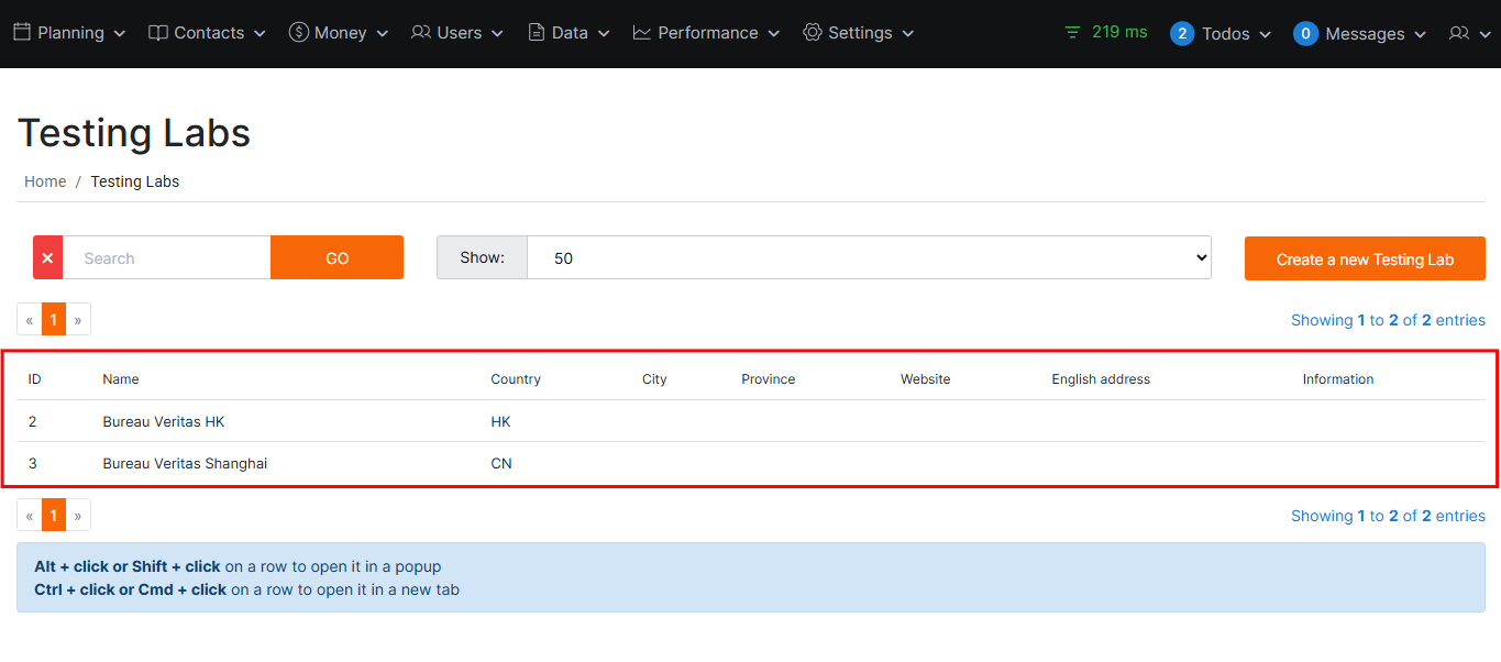 | 2 | Name | Shows the name of the testing laboratory (e.g., Bureau Veritas HK, Bureau Veritas Shanghai). Click on the name to view detailed information. |