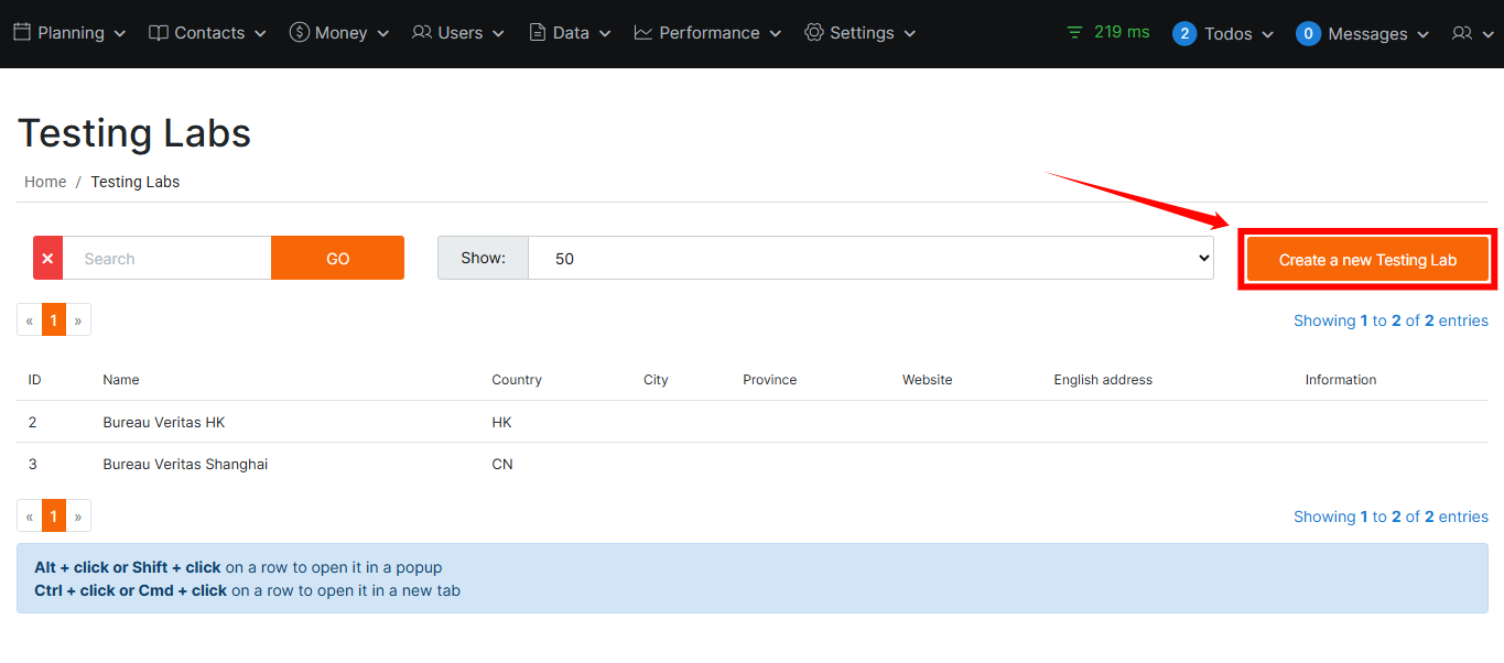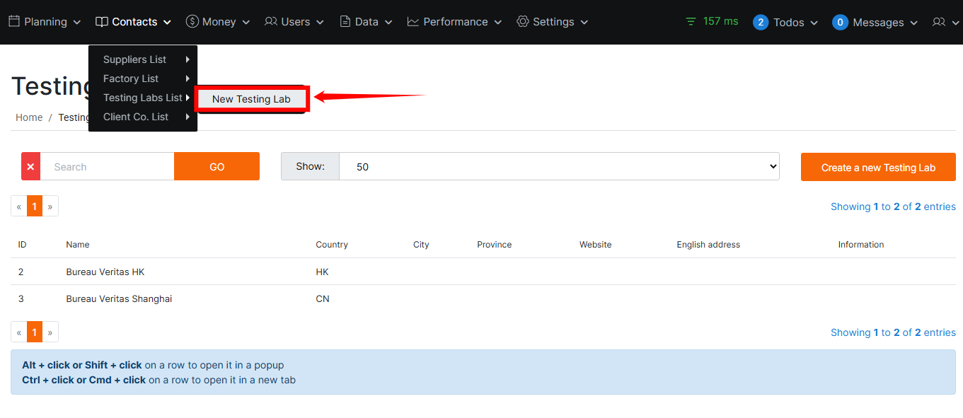Alternatively, navigate to Contacts → Testing Labs List → New Testing Lab.