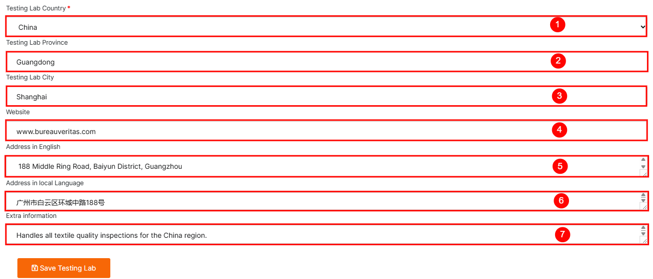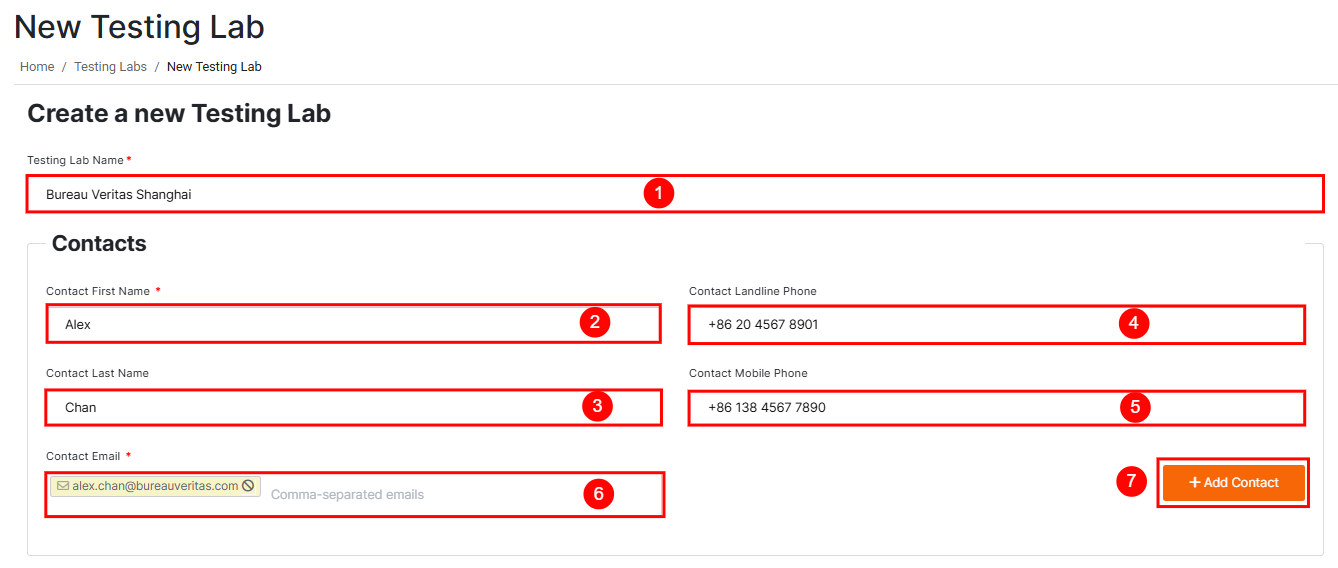 Enter the key details of the testing lab, including its name, location, and contact information. These details help identify the lab and make it easier to communicate with the right contact person.