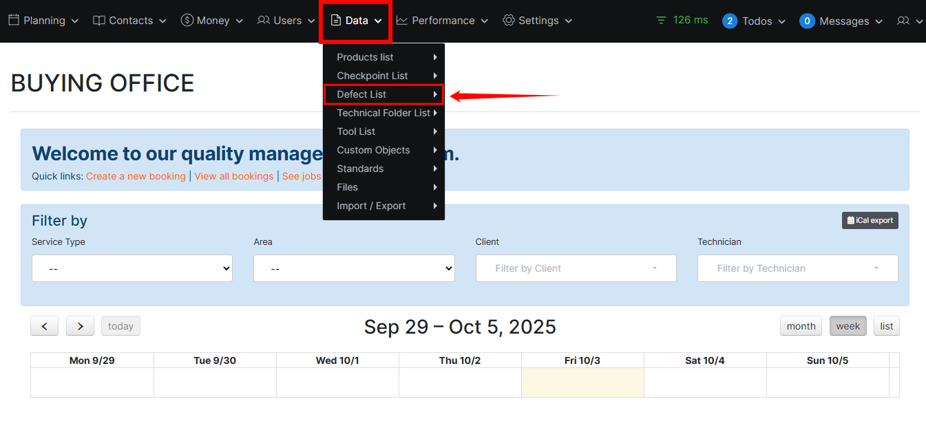 Step 1: Log in to your account and click Data from the top navigation bar, then select Defect List from the dropdown menu.