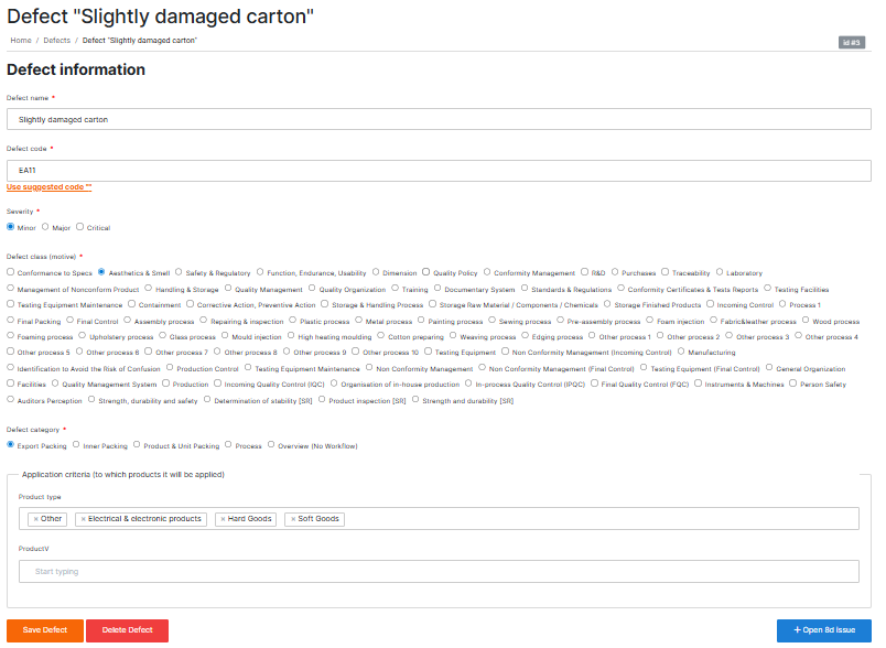 | 3 | Name | Short, descriptive title of the defect (e.g., Slightly damaged carton). |