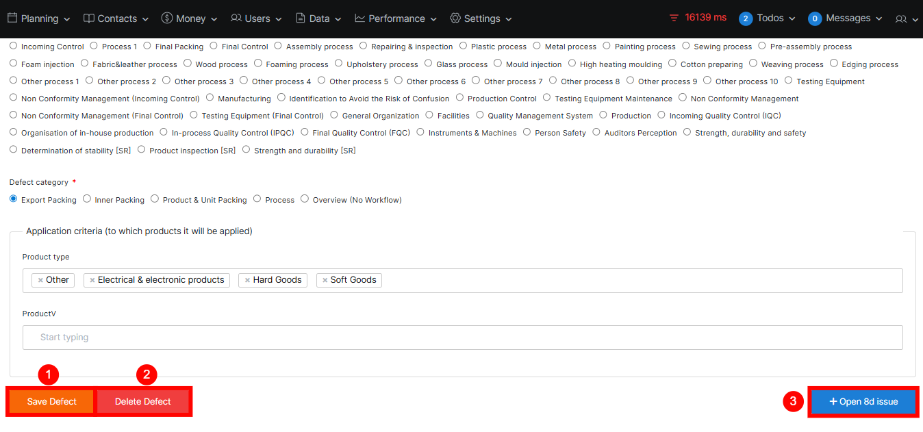 | 3 | Open 8D Issue (blue button) | Create or link an 8D Issue (Eight Disciplines corrective action process) for this defect, useful for quality problem tracking and root cause analysis. |