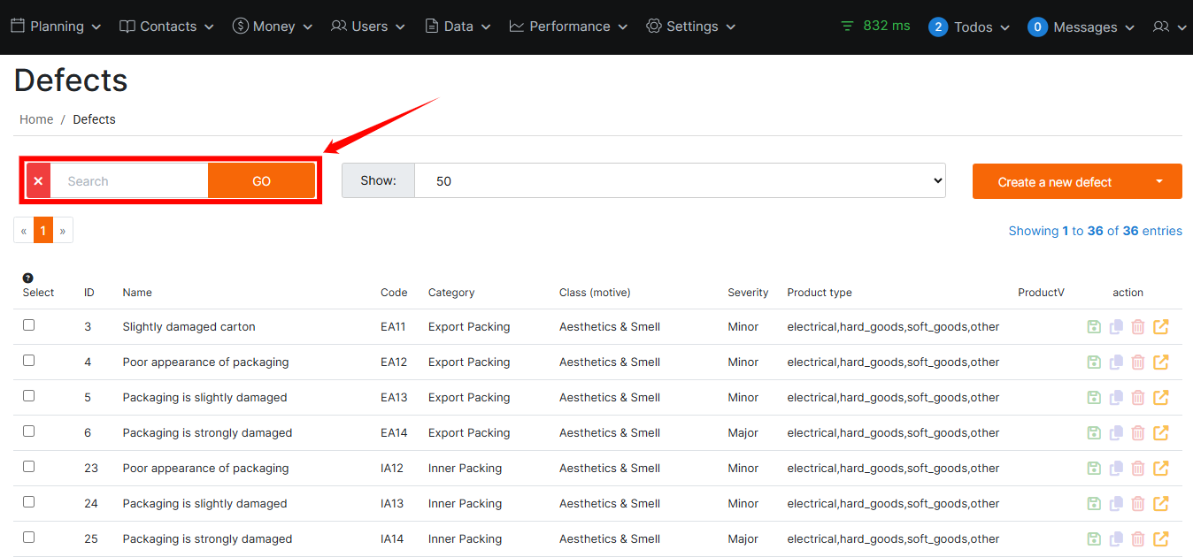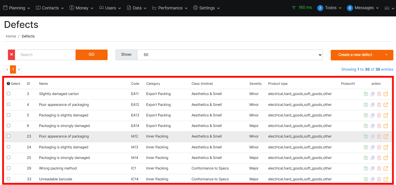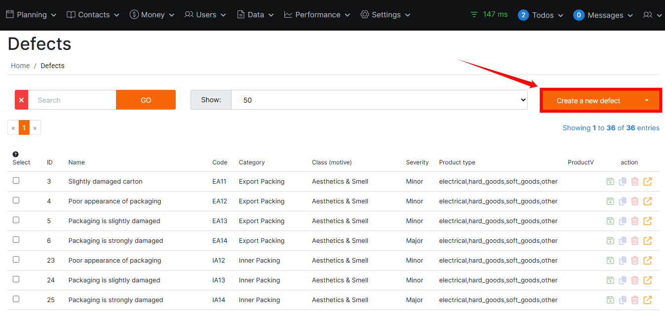 Found in: Data > Defect ListThe Defect List is where you manage all product defects in one place. You can log new defects, classify them by category and motive (class), set severity, link them to product types, and keep everything organized for audits and inspections. It also lets you update existing defects, export lists for reporting, and perform bulk edits to save time.