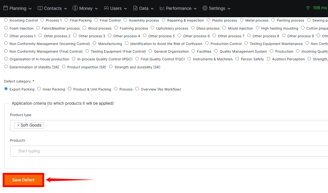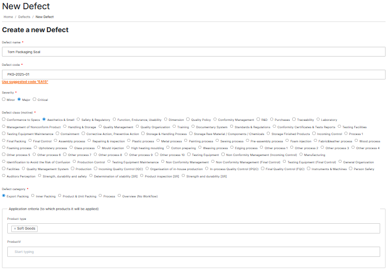 When a new issue is identified during inspections or quality checks, it needs to be recorded in the system so it can be tracked and resolved. In such cases, you can create a new defect and capture all its important details including the name, code, category, class (motive), severity, and the product scope it applies to.