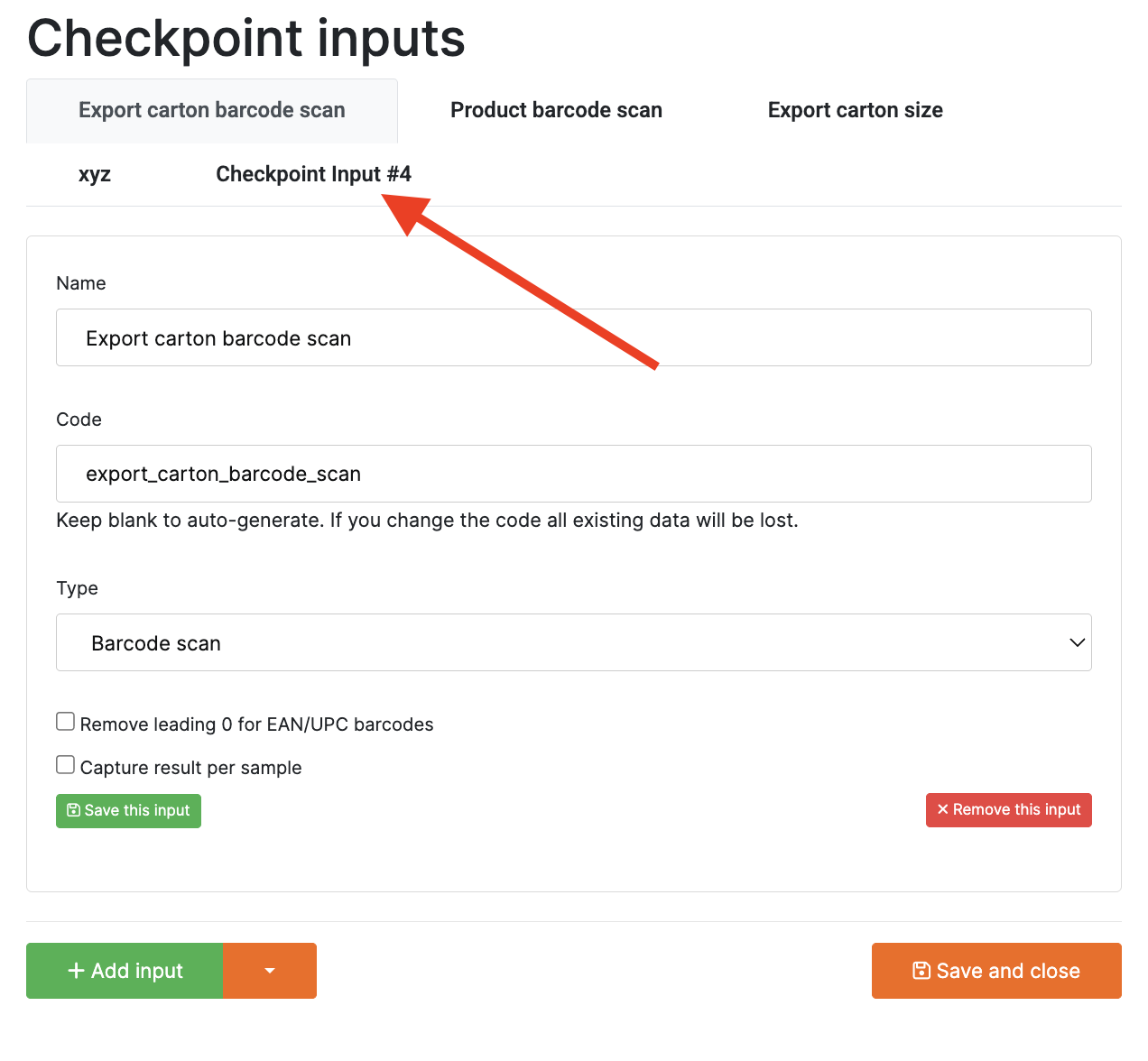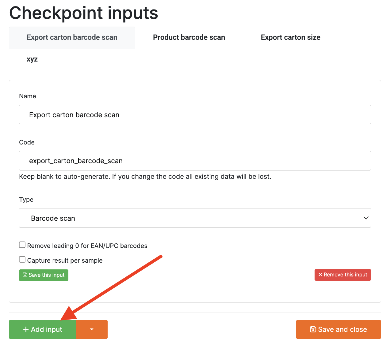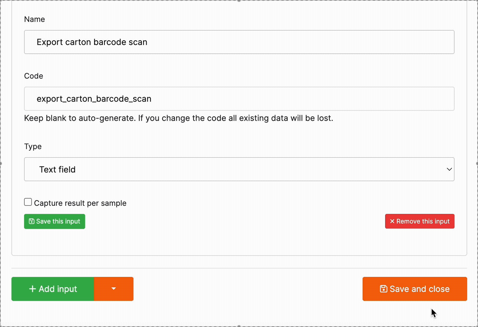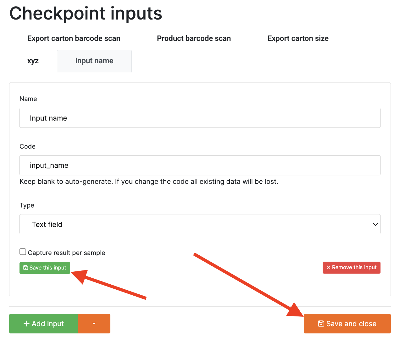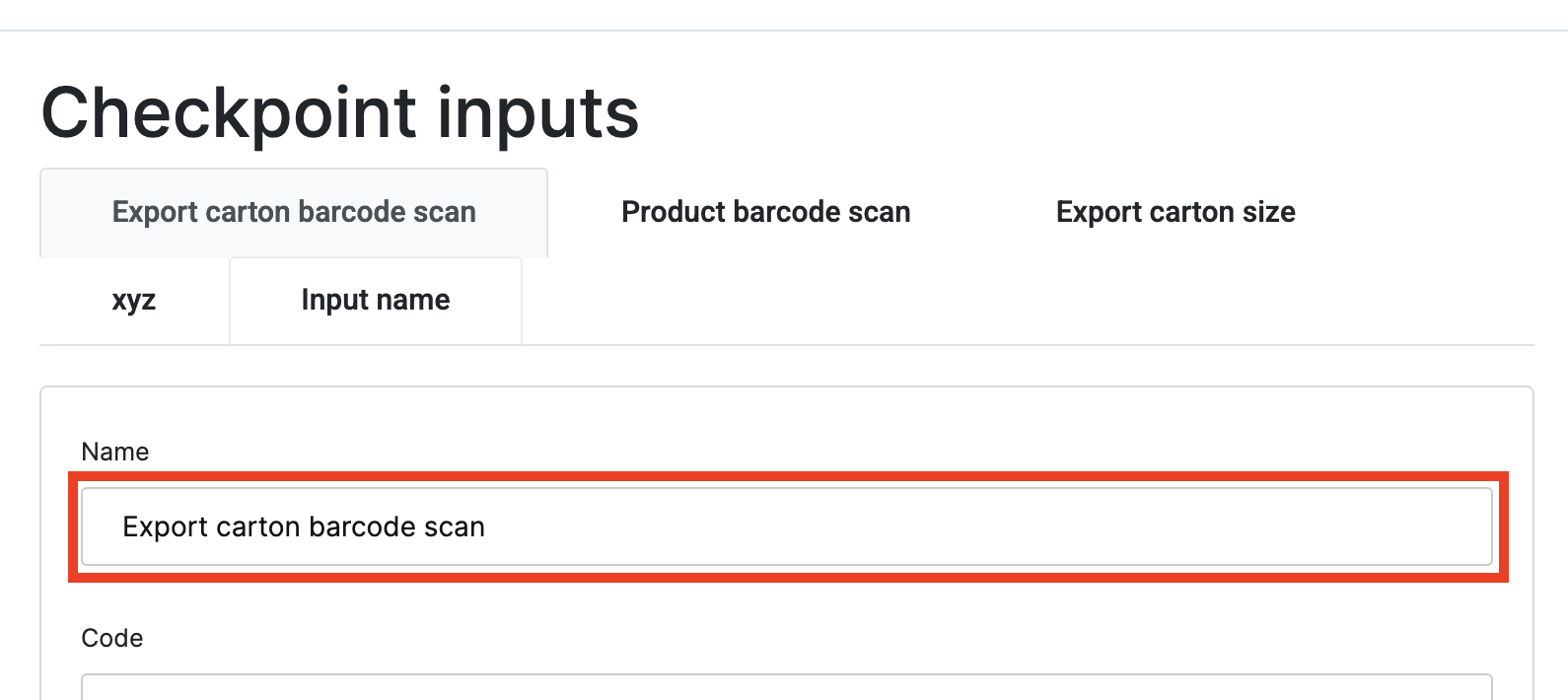 1. Enter the Input Name: Provide a clear and descriptive name (e.g., Export Carton Barcode Scan). This helps technicians understand what data they need to enter.