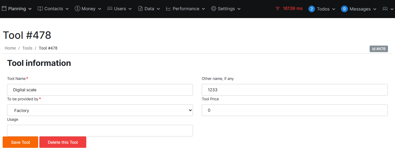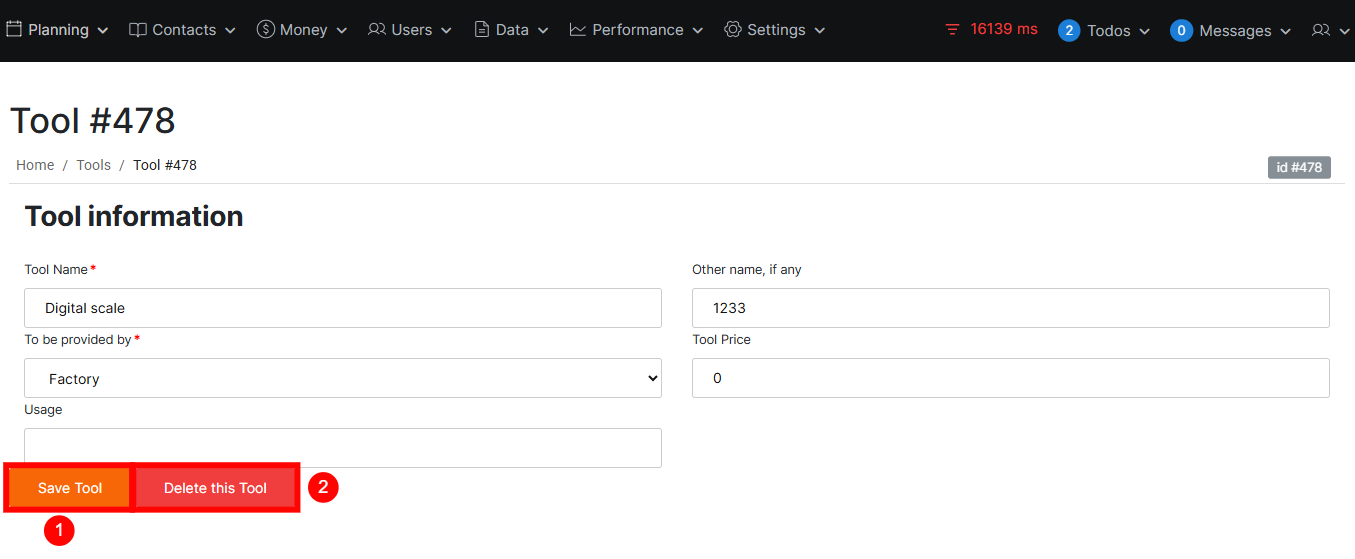 | 2 | Delete this Tool (red button) | Permanently delete the tool. A confirmation is required before deletion. Use this only if the tool was entered incorrectly. |