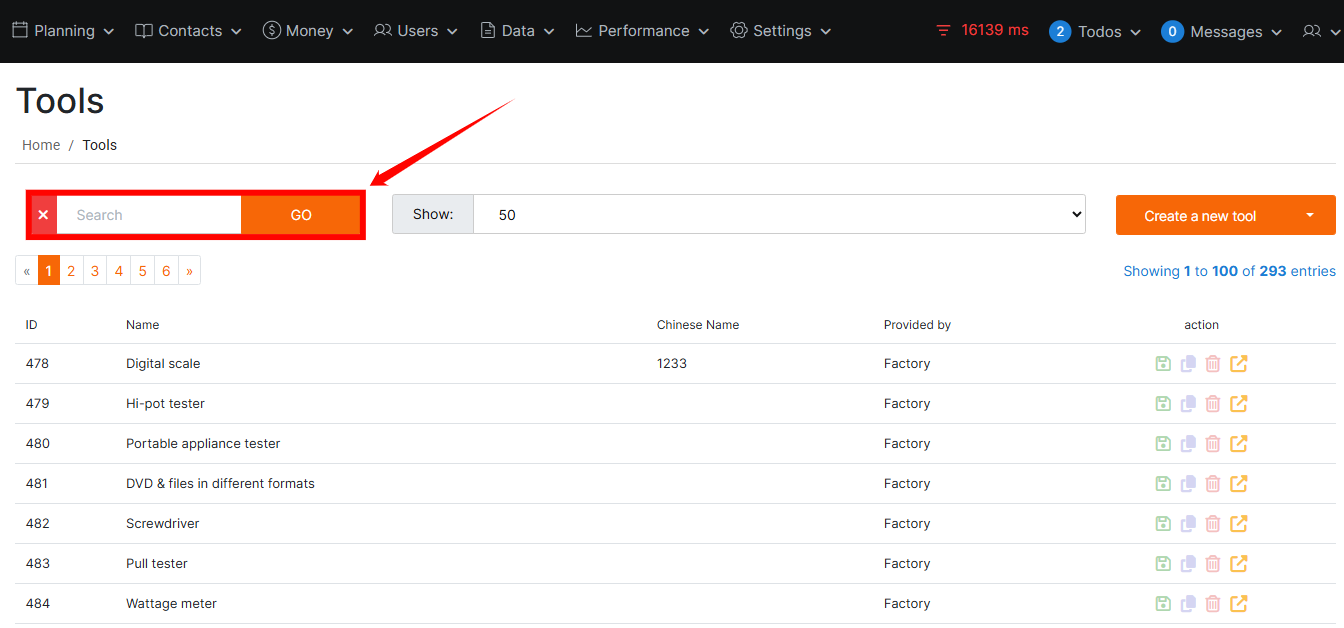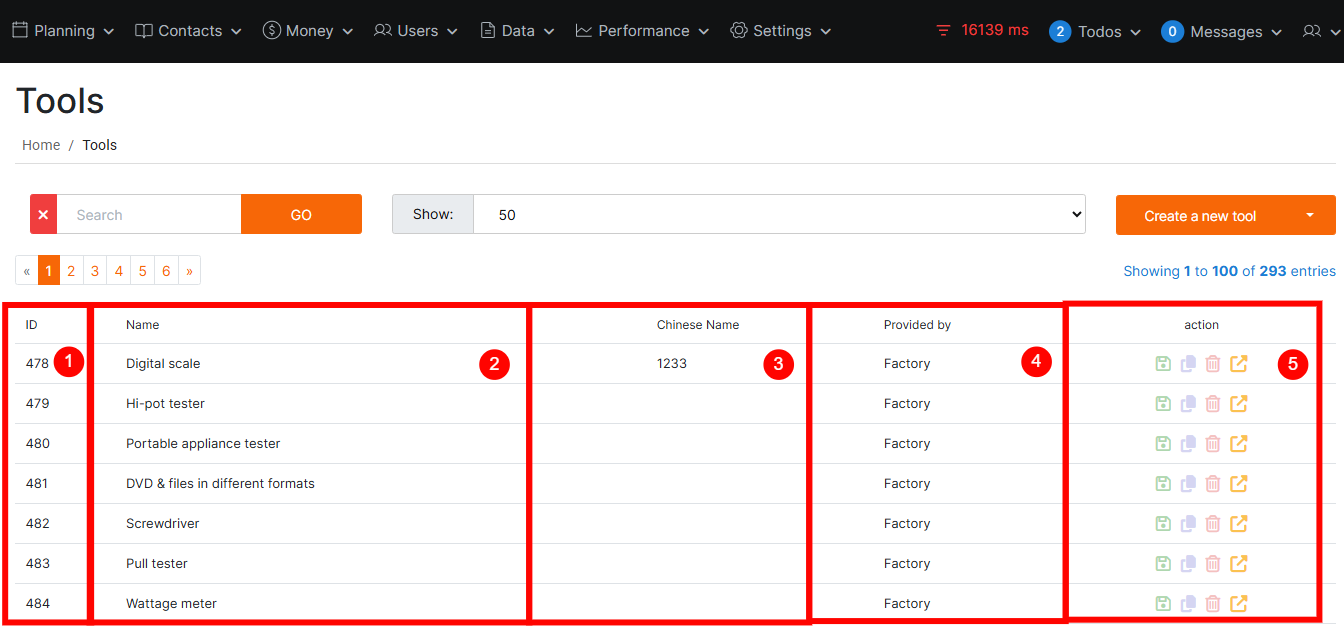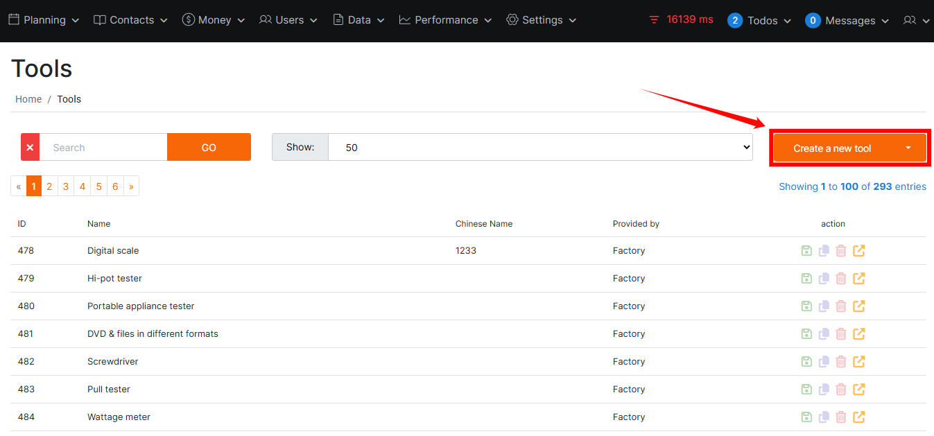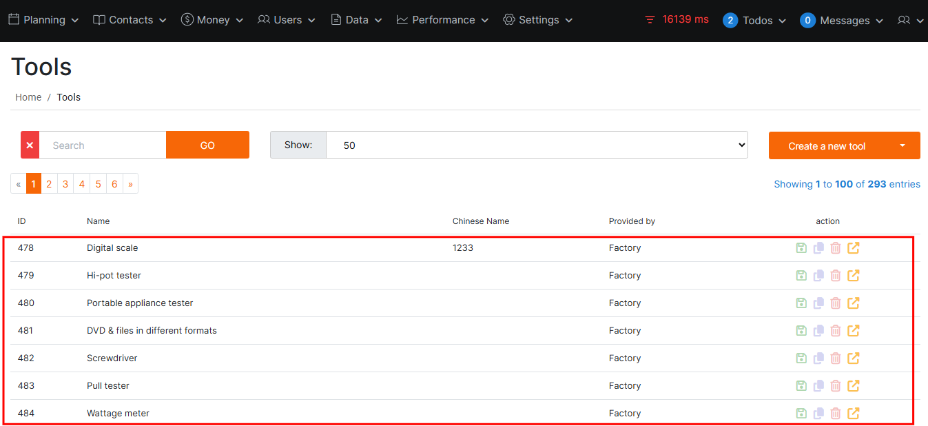 You can view and manage tools directly from the Tools list. From here, you can review tool details, edit or update records, delete incorrect entries, clone similar tools, and export data for reporting. These actions help keep tool inventory organized and accurate.