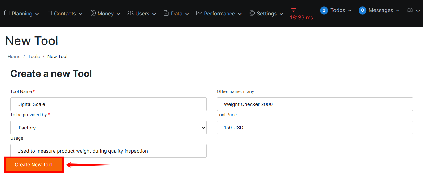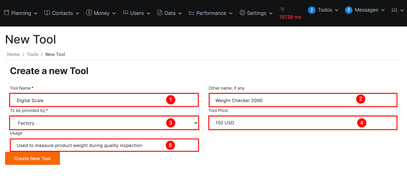 When a new tool is acquired or identified during inventory checks, it needs to be recorded in the system for tracking and management. In such cases, you can create a new tool and capture all its important details, including the name, provider, and optional fields like other name and price.