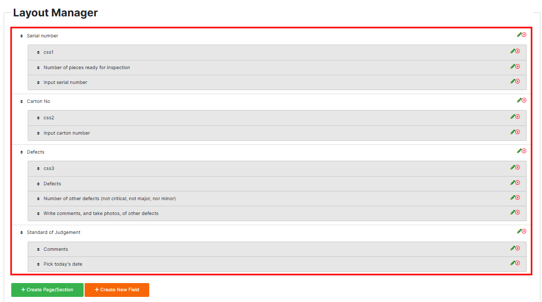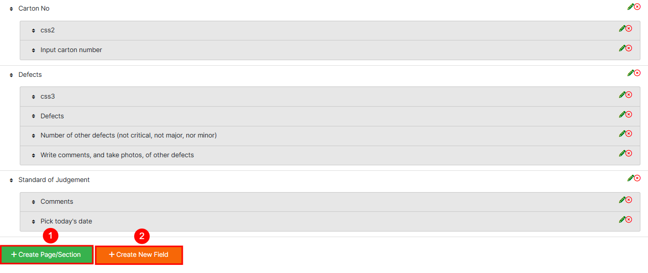 + Create Page/Section → Use this to add a new screen or group of related inputs. For example, you might create a section for General Information, another for Defects, and one for Final Comments.