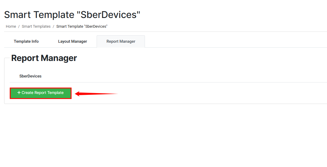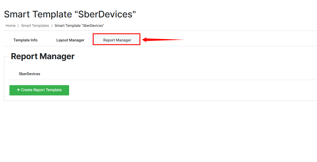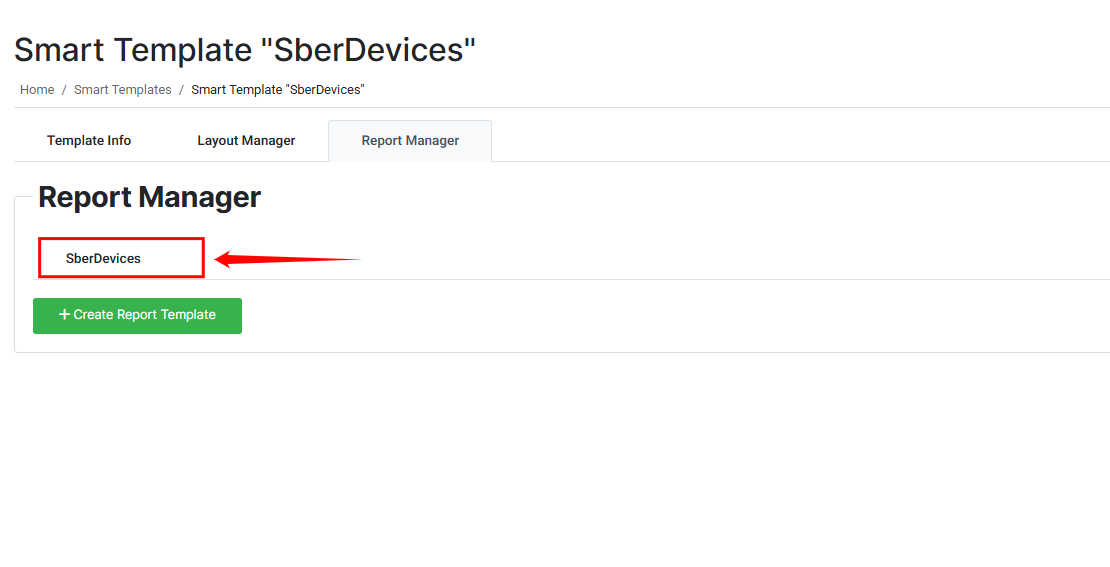 When you open the Report Manager tab, you will see a list of existing reports associated with the selected template. In the example shown, the template “SberDevices” already has one linked report.