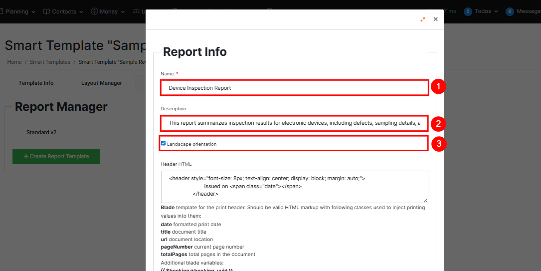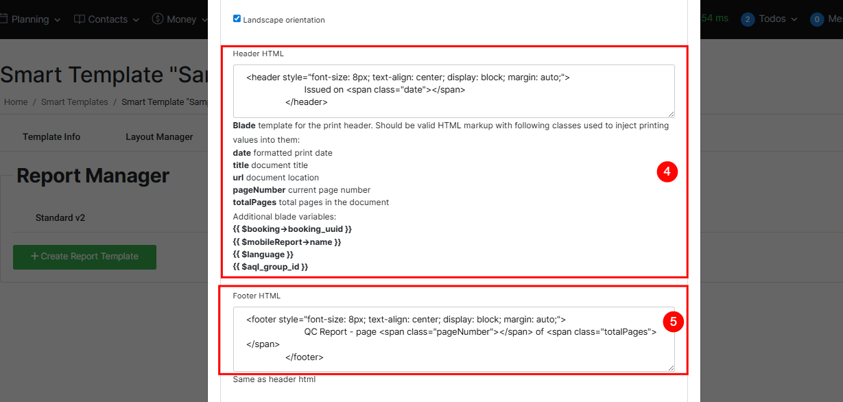 4. Header (Blade HTML) – Define the header content shown at the top of every page. You can use text, images, or dynamic variables such as date or template name.