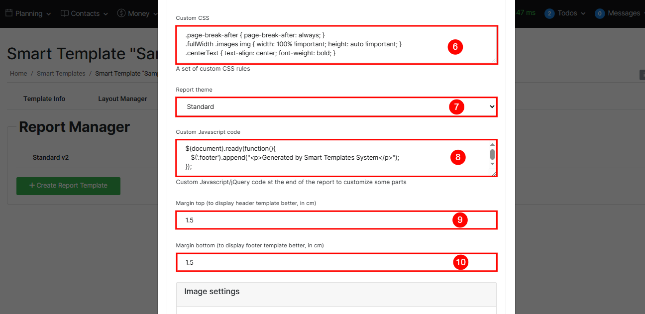 6. Custom CSS – Add CSS rules to customize the design of the report. You can change fonts, colors, margins, or create page breaks.
