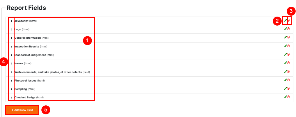 1. View Existing Fields – Each field listed represents a section or block of content that will appear in the final report. For example, you may see fields like Logo, General Information, Inspection Results, or Comments.