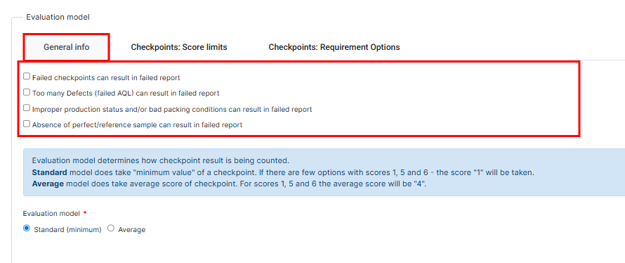 Standard (Minimum): Uses the lowest (minimum) score of all checkpoints. If any checkpoint receives a failing score, the entire report fails.
