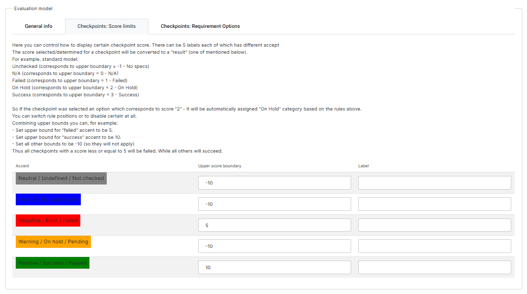 The Score Limits tab allows you to define categories for checkpoint results. Up to five result categories can be configured. Each category has an accent (color), a label, and an upper score boundary that determines its threshold.