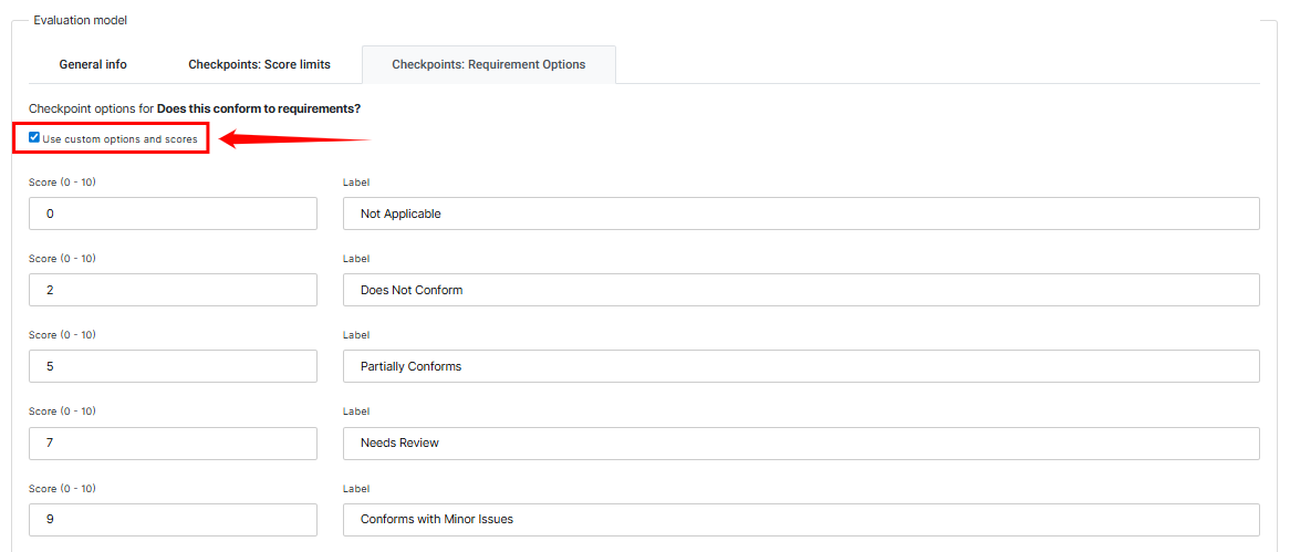 By enabling Use custom options and scores, you can define checkpoint-specific logic and assign different scores to each option. This gives you fine-grained control, allowing specialized requirements to be evaluated accurately without changing the overall scoring model.